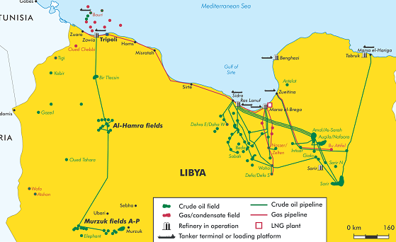 Secondly, the situation is not a 'stalemate' - it's pretty much all over for the rebels. Gaddafi now has control over almost all the oil of the country (through the three ports of Las Ranuf, Zawiya and Brega) ( http://3.bp.blogspot.com/-61T5geuGCe0/TWTjQ_MBYqI/AAAAAAAAAKk/rustlifCYfw/s1600/libya.PNG ), controls the land routes and the water supply to Benghazi (which comes from the desert aquafers in Fezzam - http://en.wikipedia.org/wiki/Great_Manmade_River), and the critical road cutting off Benghazi between Ajdabiya and Tubruk. Benghazi cannot exist for long once Qaddafi reaches Tubruk and cuts off the entire Benghazi peninsula from Egypt and the east. There are no options now for Benghazi, and the only military capable of intervening, the US, will not do so: the oil companies know better.